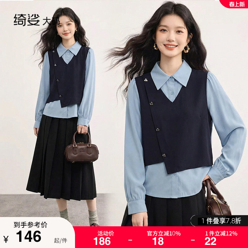 绮娑2026春装新款假两件衬衫大码胖mm显瘦设计感正肩Polo领上衣女