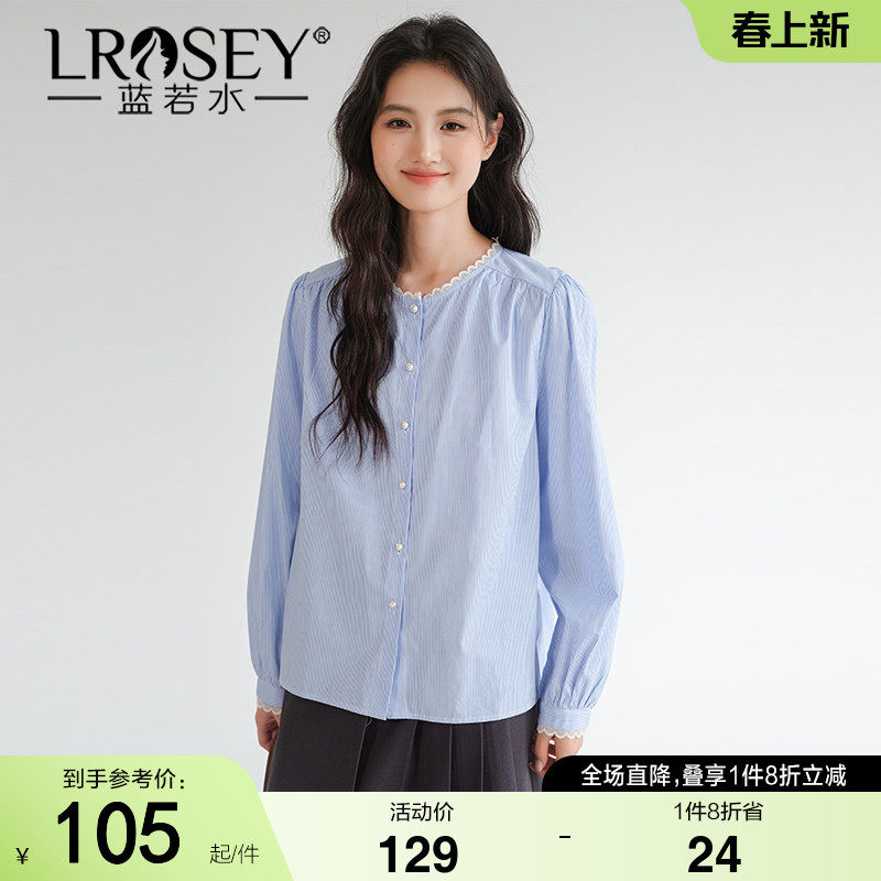 蓝若水大码女装蕾丝拼接立领条纹衬衫2026新款春装胖mm设计感上衣