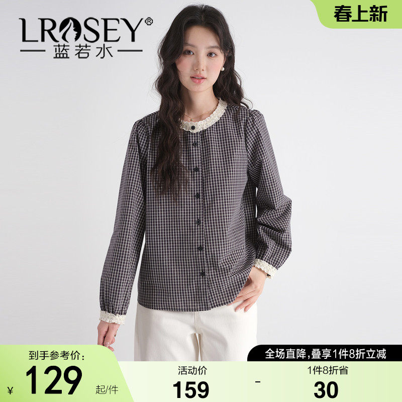 蓝若水大码女装2026春装新款复古黑白格纹衬衫胖MM蕾丝边拼接上衣