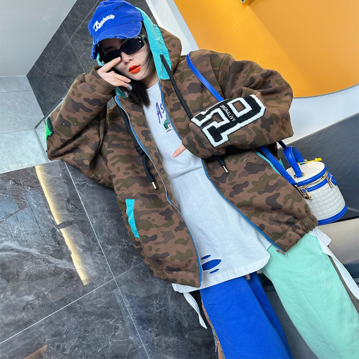 欧货大码女装重工刺绣迷彩外套潮牌高级感春季宽松连帽印花卫衣bf