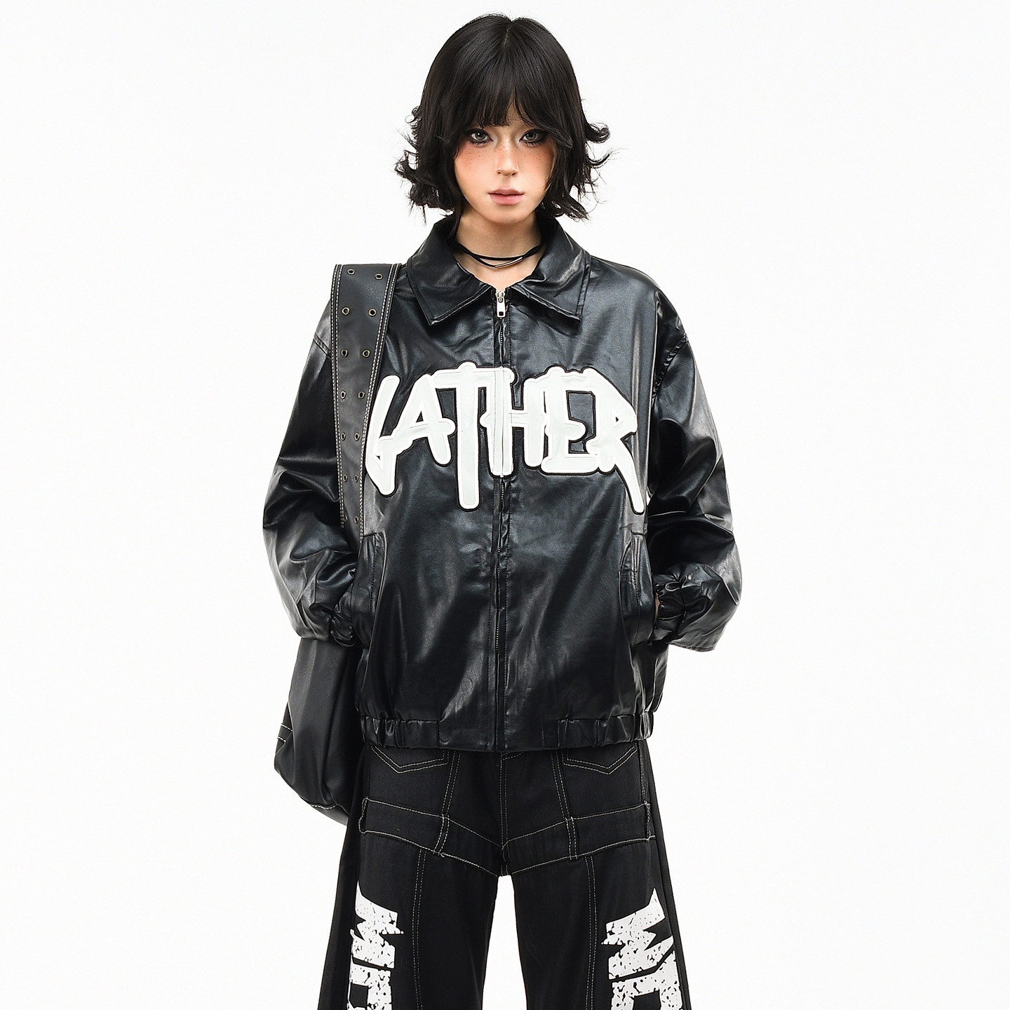 OV原创美式潮牌字母刺绣PU皮翻领外套女春季宽松机车夹克bf上衣男