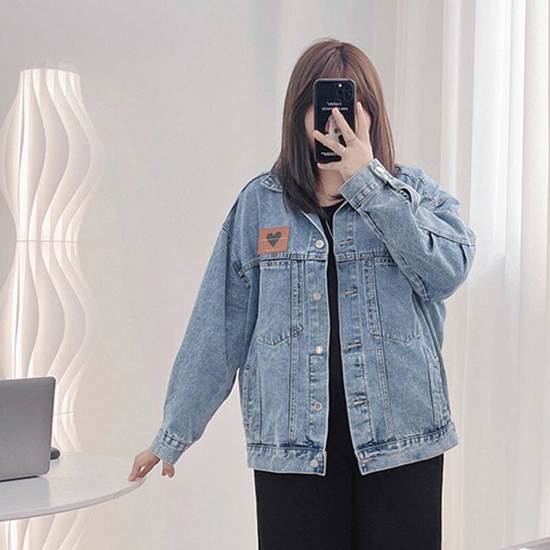 大码牛仔外套女200斤春秋季新款潮流韩版笑脸爱心bf绣花上衣ins潮