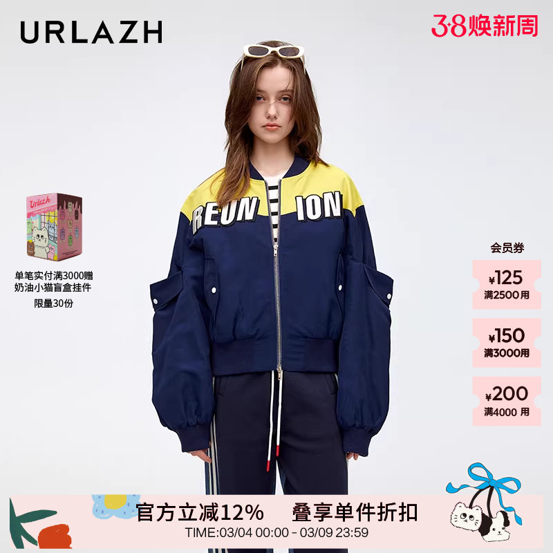 URLAZH有兰新款复古休闲宽松时尚设计感撞色BF风刺绣棒球外套女