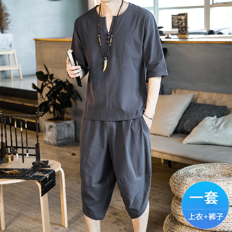 亚麻短袖t恤男套装夏季中国风宽松V领半袖上衣棉麻唐装两件套男装