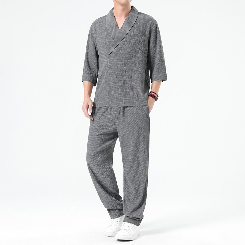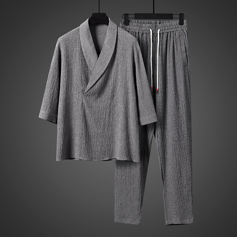 中国风男装夏季复古风冰丝T恤短袖男士套装上衣V领中式汉服七分袖