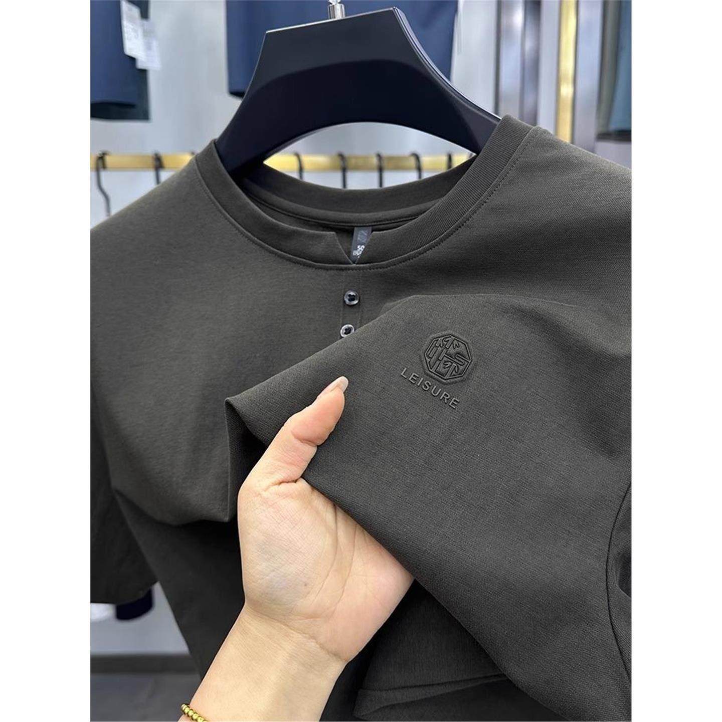 啄木鸟夏季冰丝t恤男短袖中年宽松半袖薄款V领真丝体恤中国风男装