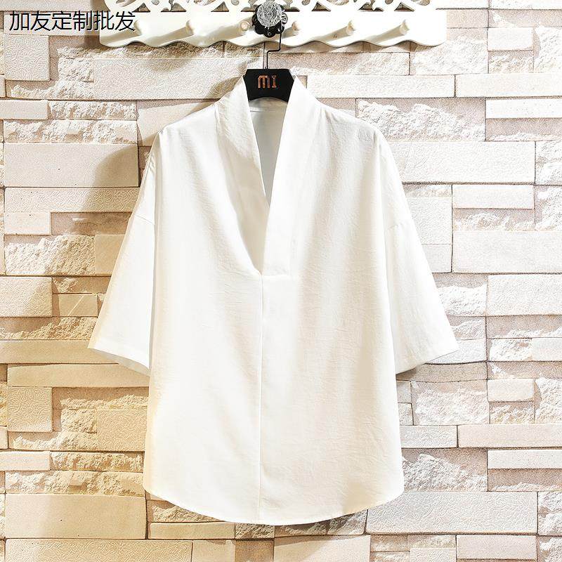 中国风男装夏季复古风棉麻T恤短袖男士亚麻上衣V领中式汉服七分袖