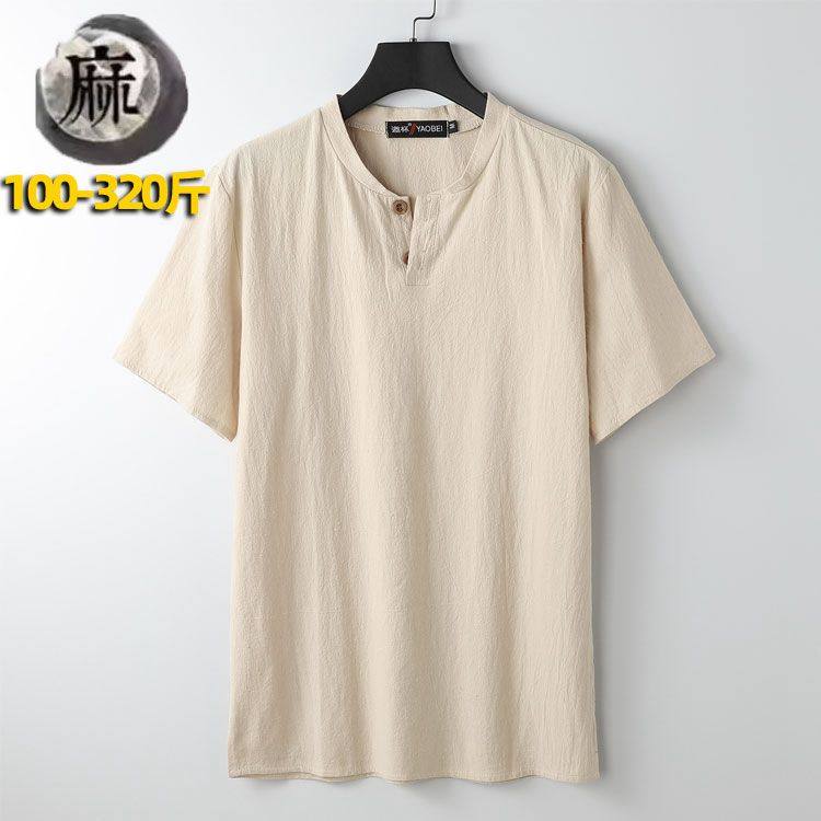 亚麻V领短袖t恤男新中式加肥加大居士上衣胖子中国风棉麻禅修半袖