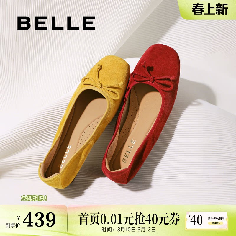 百丽舒芙蕾羊皮芭蕾红黄色平底单鞋女新款软底蛋卷鞋子B2804CQ5