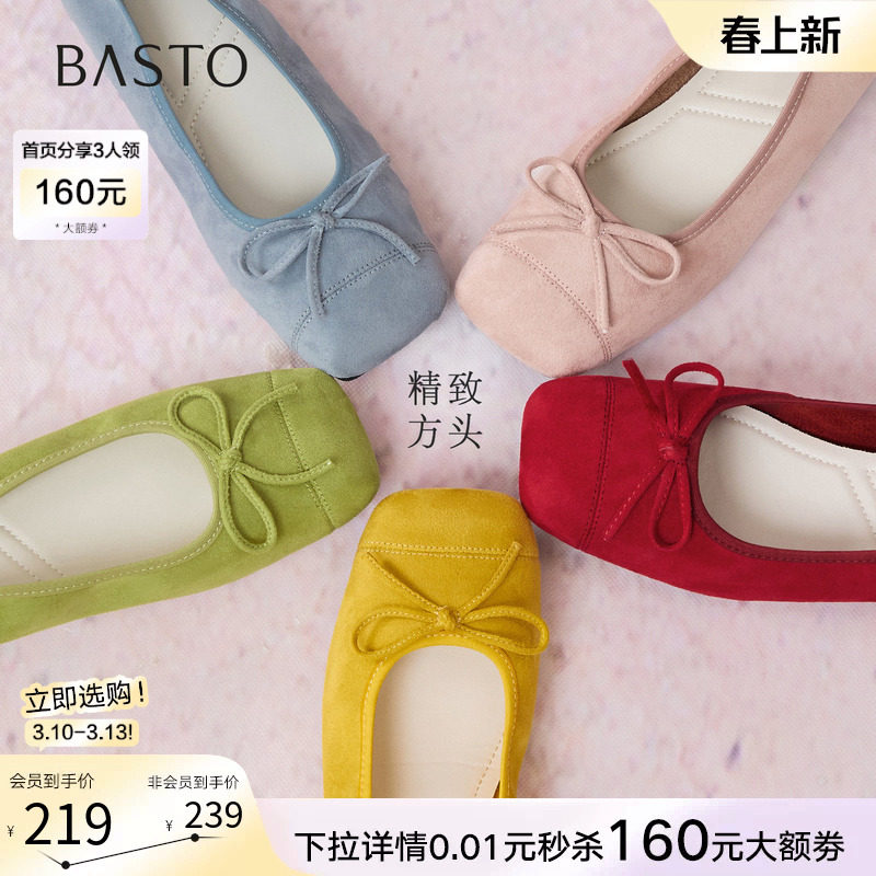 百丽舒芙蕾羊皮方头平底单鞋女款26新款蛋卷芭蕾单鞋子B3090AQ6预