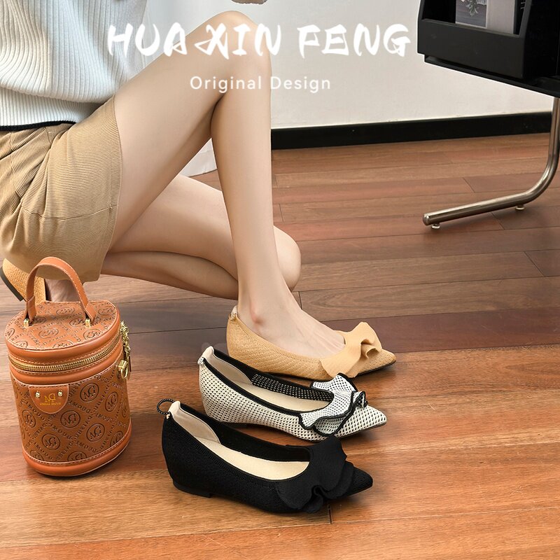 花信风~内增高荷叶边飞织鞋女法式裸穿鞋蛋卷鞋尖头浅口平底单鞋