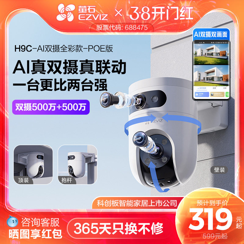 萤石H9c室外双摄全景智能AI摄像头家用手机远程夜视监控POE版