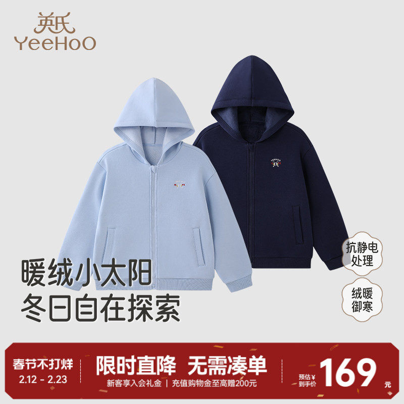 英氏男童开衫外套上衣2025秋冬季新款休闲百搭中大童加绒连帽卫衣