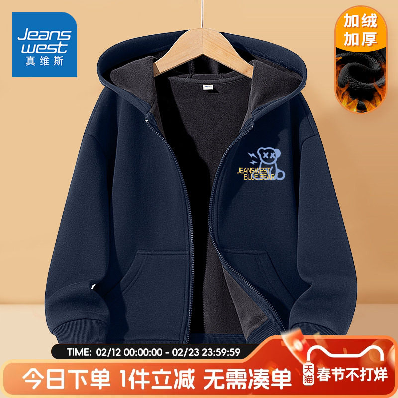 真维斯童装男童外套秋冬季大童冬款加绒加厚卫衣运动开衫儿童冬装