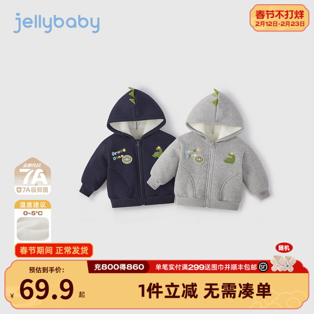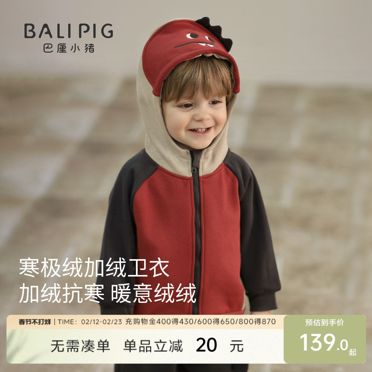 [抗菌远红外]男宝外套儿童秋冬恐龙萌趣加绒连帽上衣开衫男童卫衣