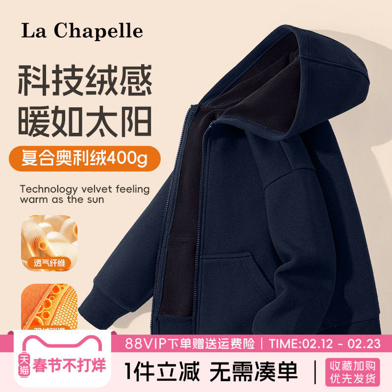 拉夏贝尔男童薄绒外套儿童一体绒秋冬款加厚连帽卫衣男孩加绒开衫