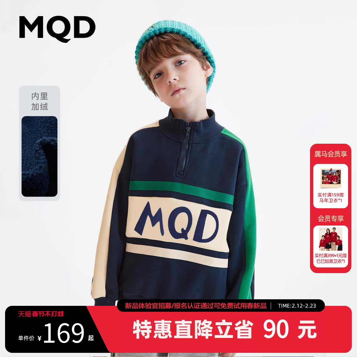 MQD童装男童加绒卫衣秋冬款宝宝儿童保暖上衣外套半高领打底衫