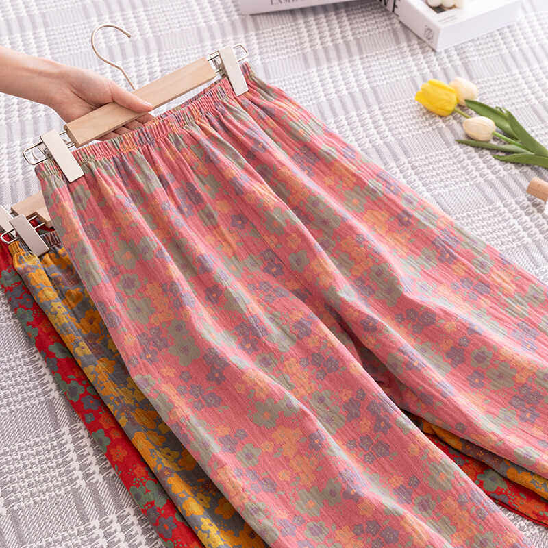 纯棉双层纱睡裤女士民族风夏季薄款宽松防蚊裤 可外穿阔腿家居裤