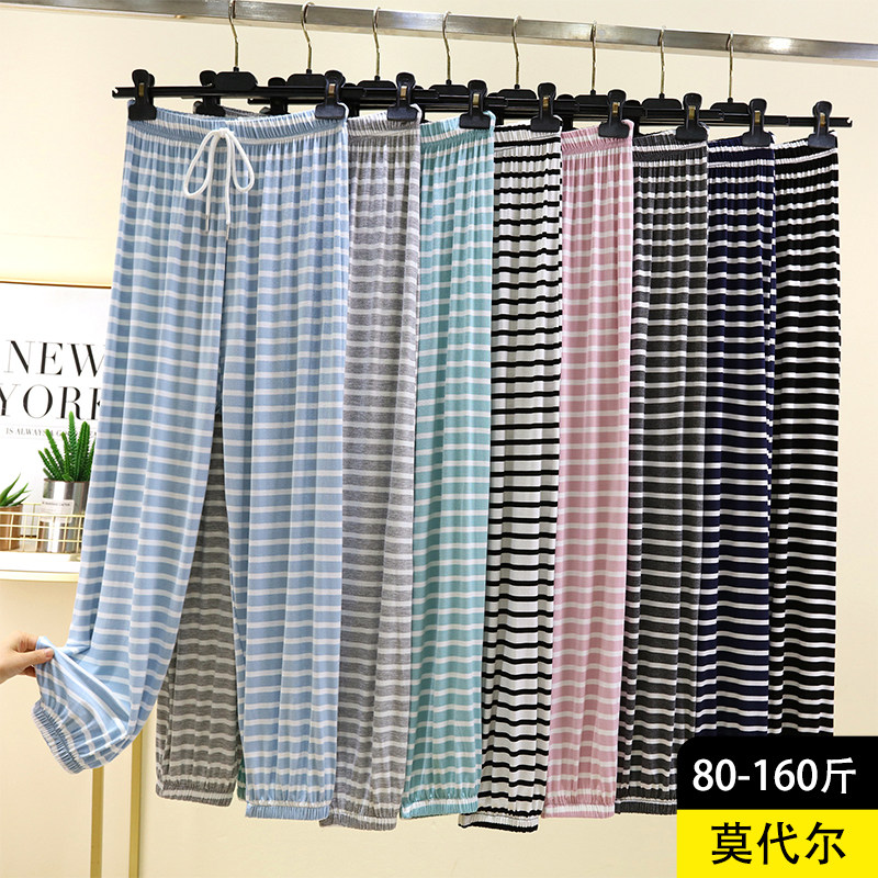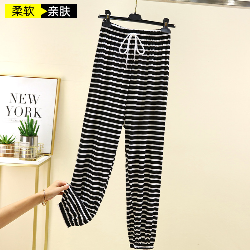 莫代尔条纹束脚睡裤女夏季薄款防蚊裤抽绳家居裤外穿宽松大码长裤