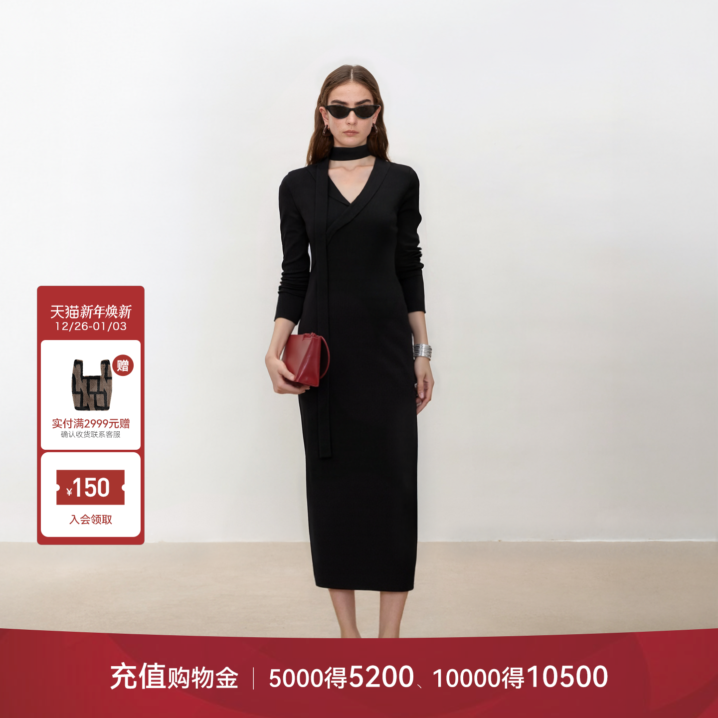 LYNEE【小黑裙】2025秋冬新款百搭显瘦黑色连衣裙女V领针织打底裙