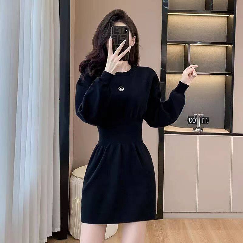 长袖连衣裙 秋冬新款显瘦针织裙中长款内搭打底毛衣裙女a字小黑裙
