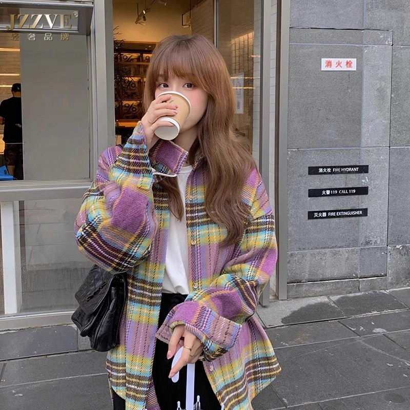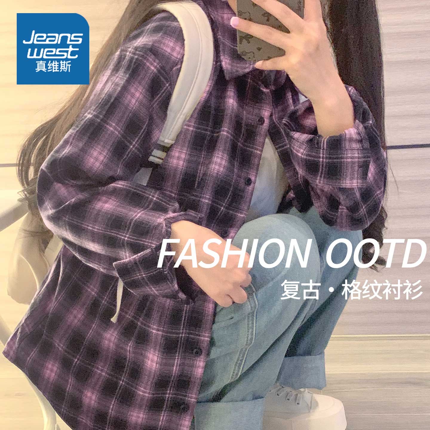【姹紫嫣红】紫色格子衬衫外套女复古韩版小个子长袖加厚衬衣女款