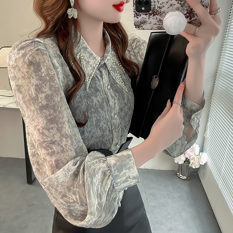 韩版亮丝衬衫女款2025新款泡泡袖上衣显瘦时髦不规则珍珠领衬衣冬