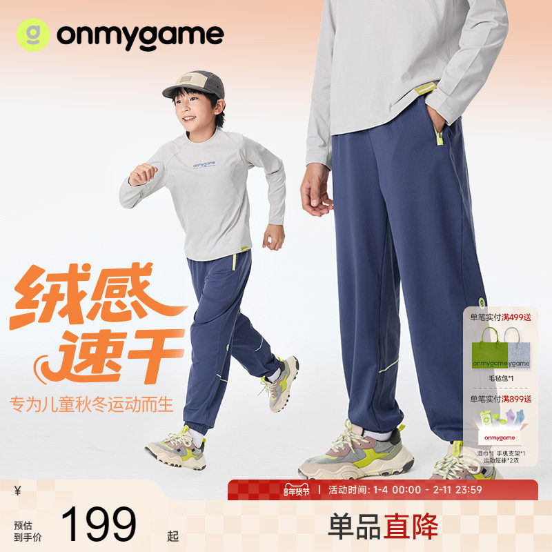 onmygame【绒感速干】儿童运动长裤男女童户外束脚针织裤25秋新款