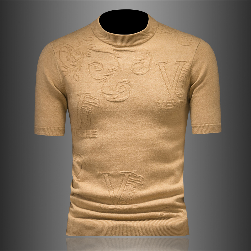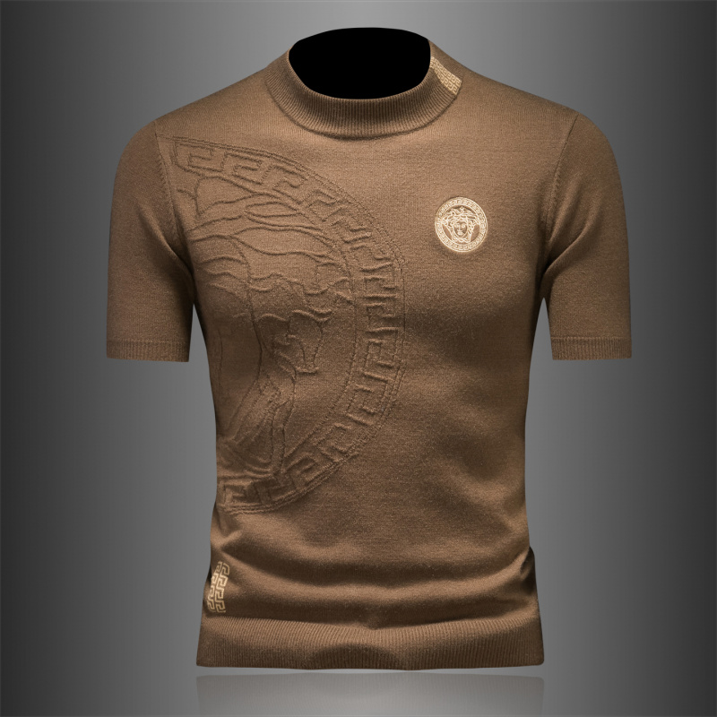 欧美简约美杜莎立体压花圆领修身羊毛衫 男式半袖针织衫 短袖毛衣