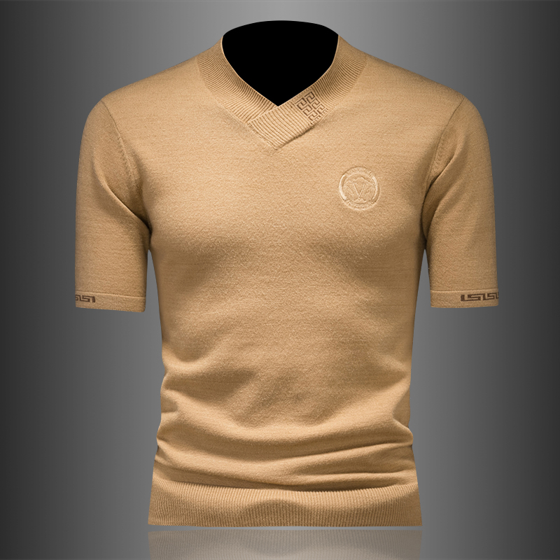 欧美潮流男装 美杜莎刺绣 V领修身羊毛衫 男式短袖针织衫半袖毛衣