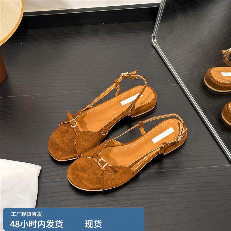 大东一字带凉鞋女鞋2025夏季新款休闲时尚平底中跟一字扣圆头0208