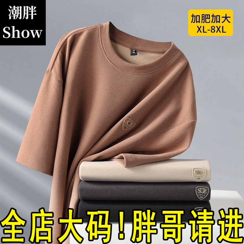 显瘦大码新款秋冬加绒短袖男胖子宽松加厚圆领T恤潮加肥加大半袖