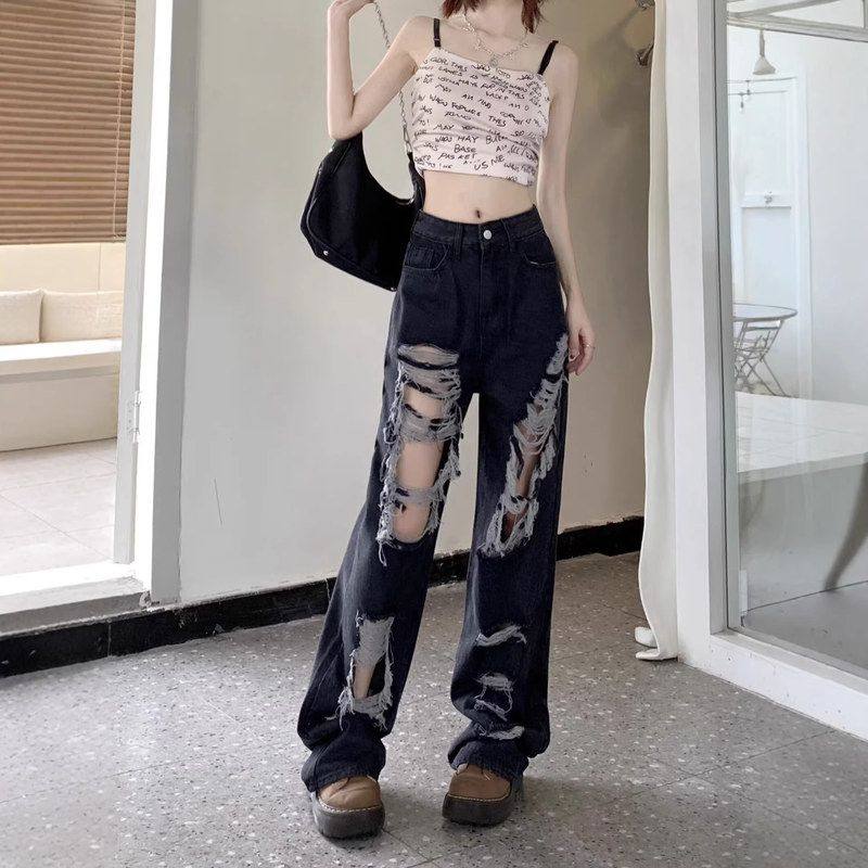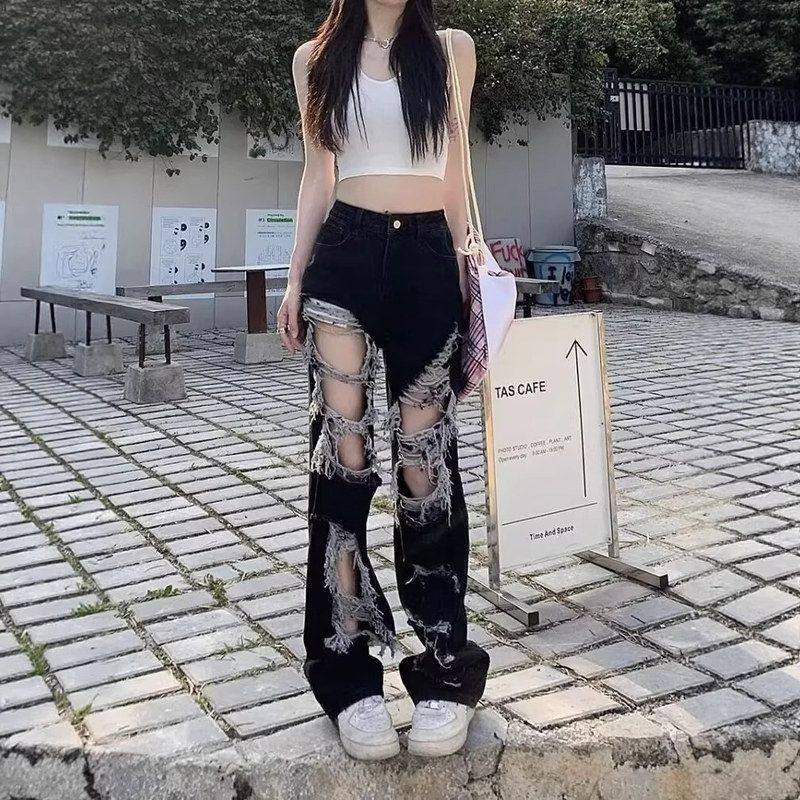 美式高街破洞牛仔裤女夏季高腰直筒宽松显瘦黑色流苏设计乞丐长裤