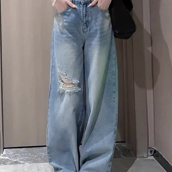 美式复古水洗做旧乞丐破洞牛仔裤女春秋新款宽松直筒阔腿拖地长裤
