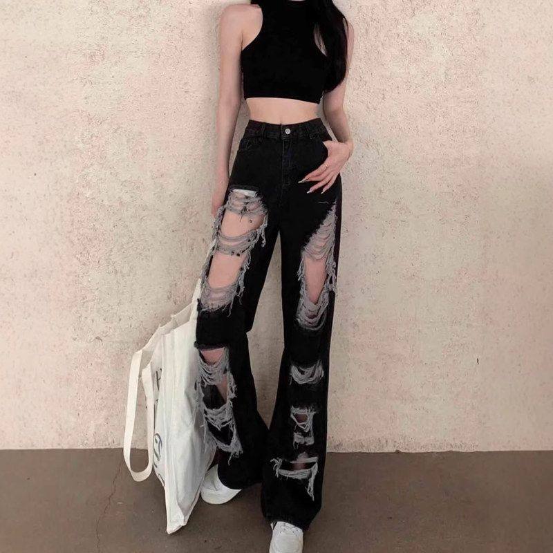 潮牌长裤乞丐女显瘦阔腿夏季裤子拖地ins港风破洞牛仔裤直筒宽松