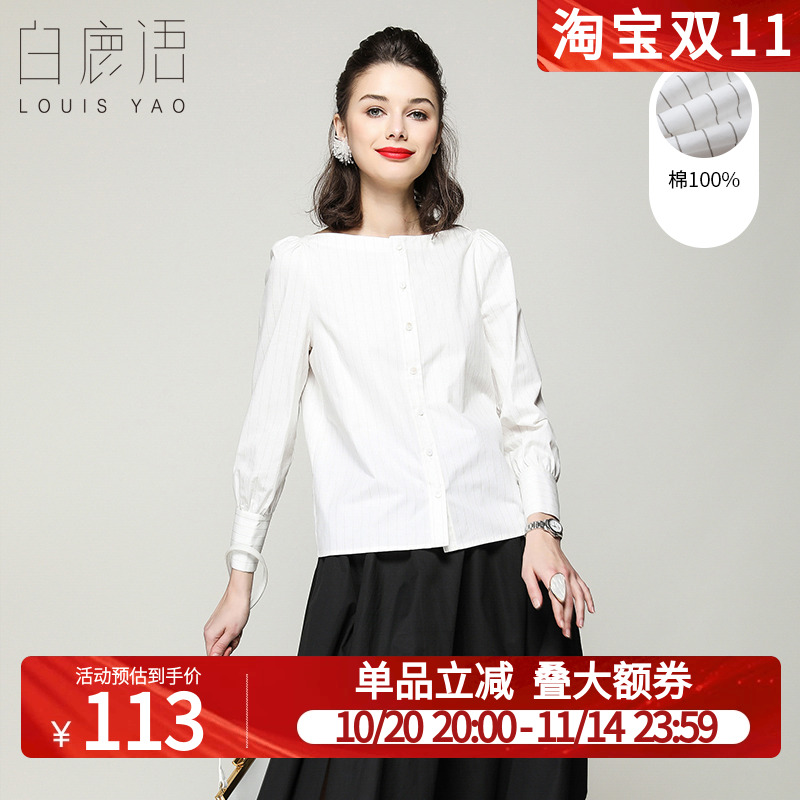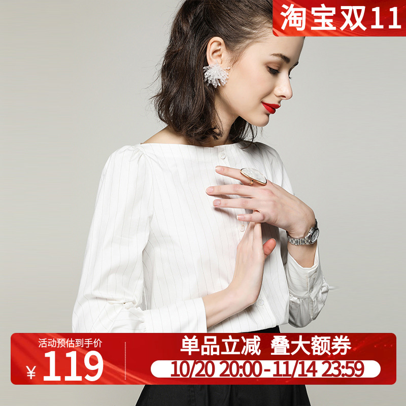 白鹿语简约条纹棉质衬衫春秋季优雅知性长袖一字领泡泡袖女式衬衣