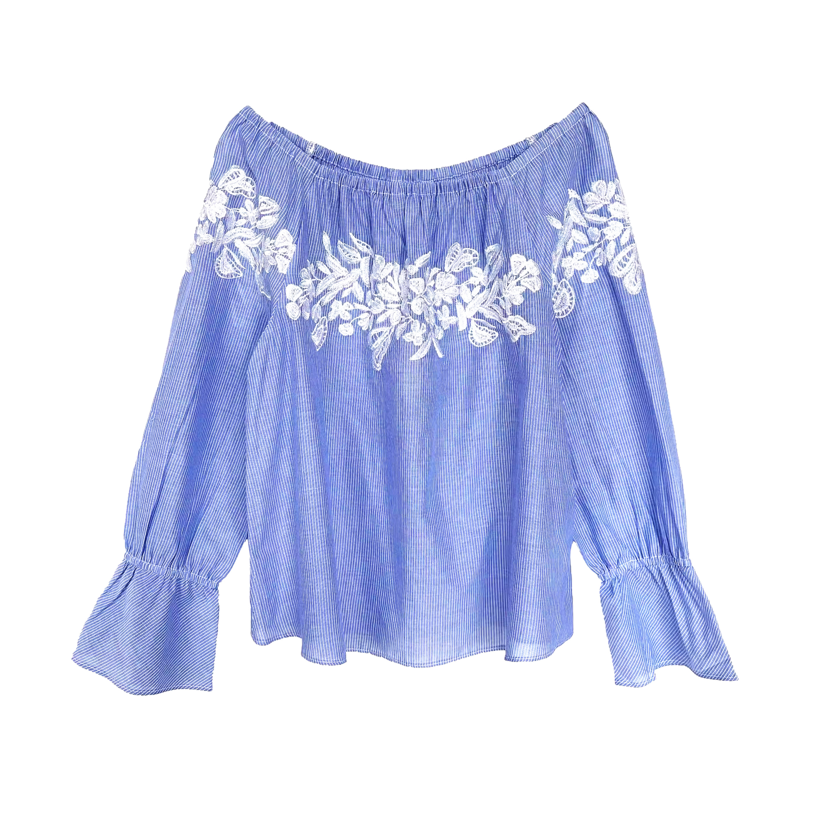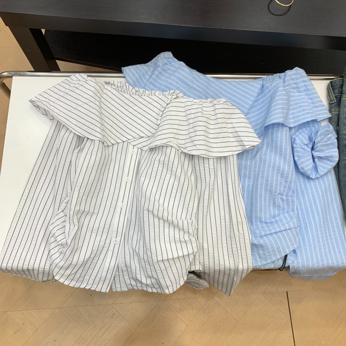 刺绣中袖衬衫 女春夏一字领露肩短款条纹衬衣 新款宽松上衣 P/8-2