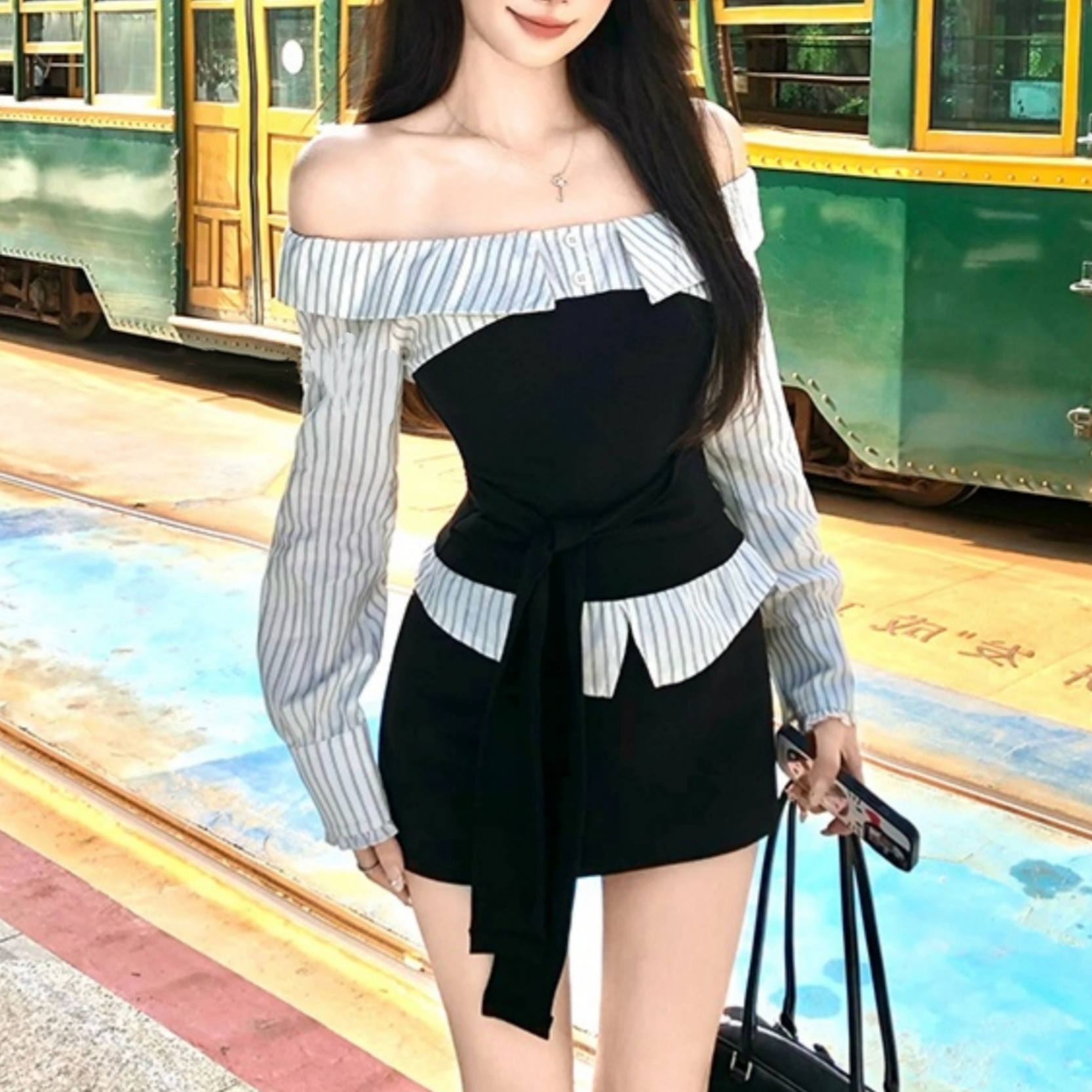 新款一字领性感露肩条纹高腰衬衫裙收腰显瘦荷叶边中长款连衣裙女