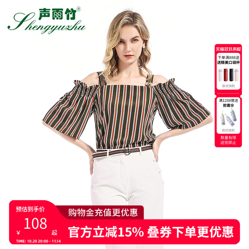310甜美吊带一字领露肩条纹衬衫79641春夏宽松显瘦减龄少女感上衣