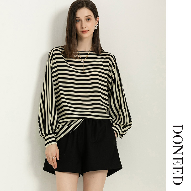 DONEED春款度假风简约宽松轻薄条纹时尚一字领长袖衬衫上衣女