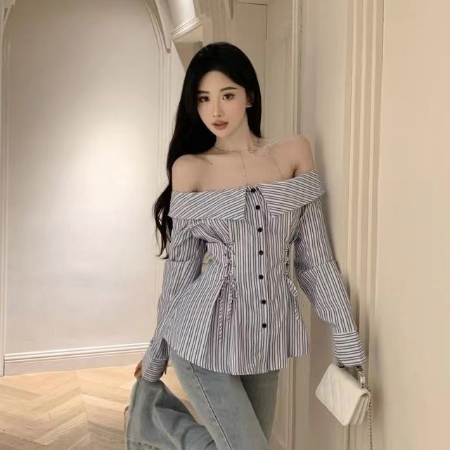 鱼兔子的兔子一字领条纹衬衫女秋冬露肩长袖衬衣绝美法式小资上衣
