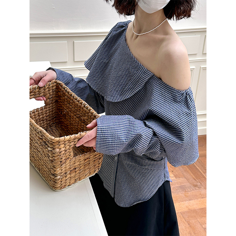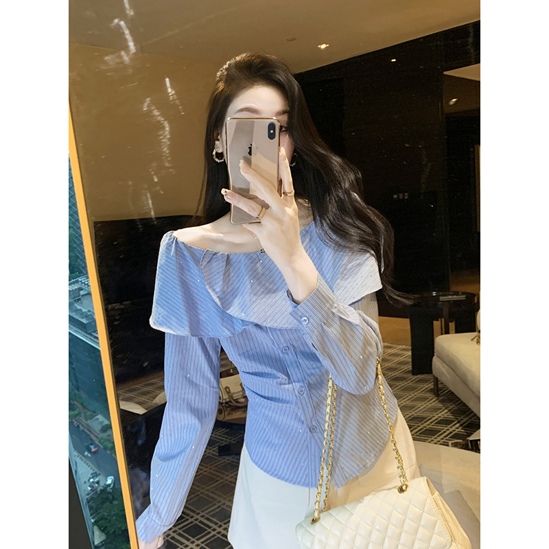 韩系荷叶边条纹一字领长袖衬衫女2025春秋季新款百搭气质露肩衬衣