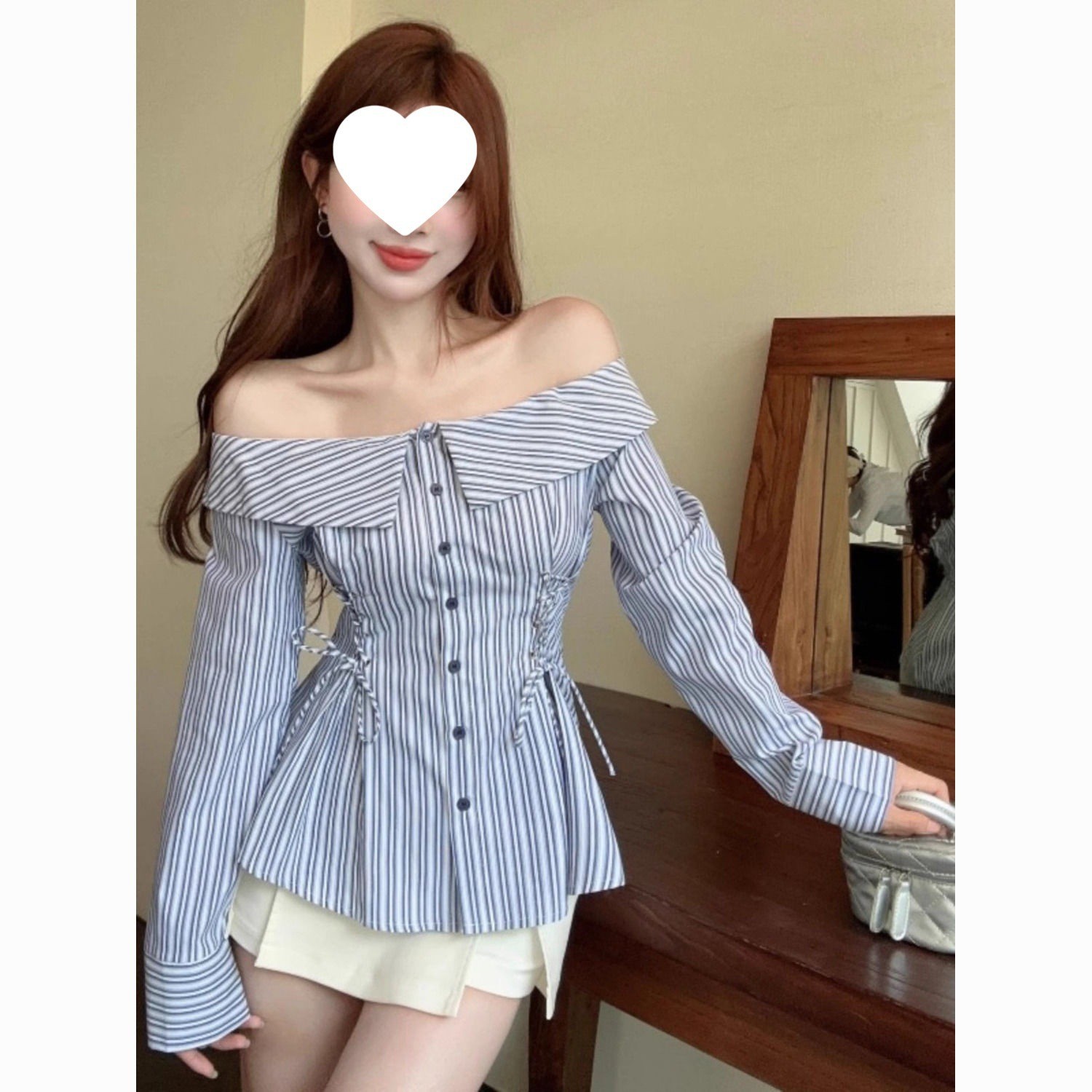 法式小众一字肩领口花边条纹衬衫女2025新款显瘦收腰气质露肩上衣