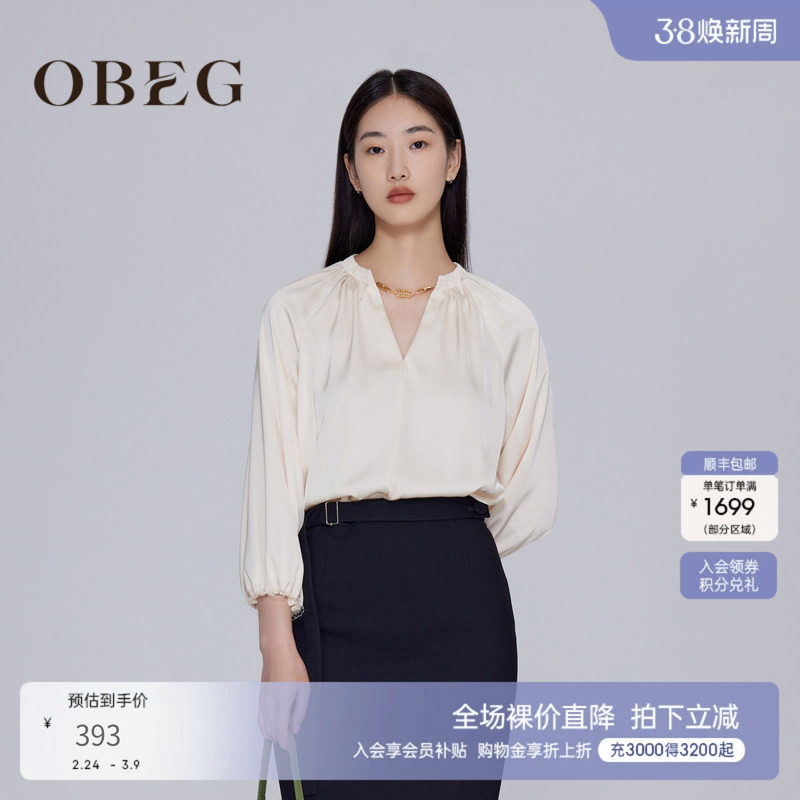 OBEG欧碧倩垂坠气质上衣女春秋时尚通勤小V领白衬衫10443011