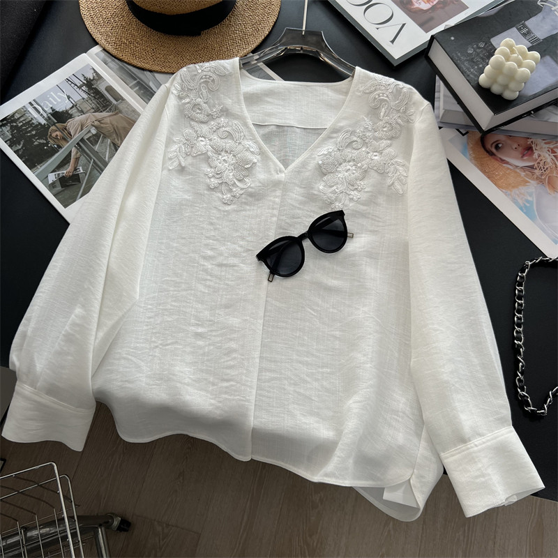 2026春新款女装V领白衬衫七分袖时尚棉绣花镂空上衣气质轻熟衬衣