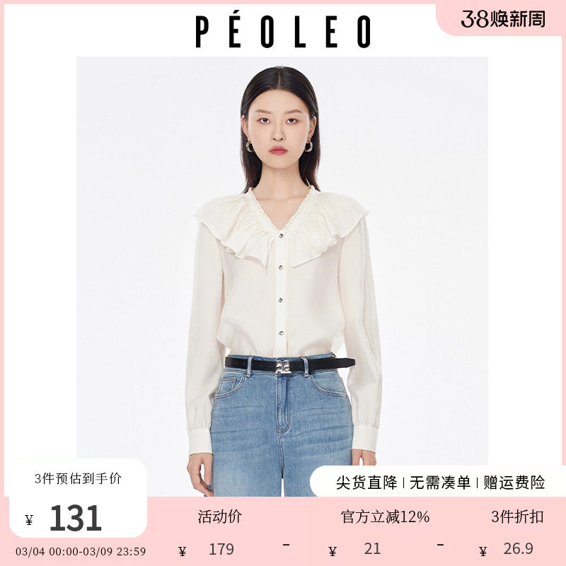 飘蕾法式荷叶边V领白衬衫2026春季新款小众设计感舒适亲肤上衣女
