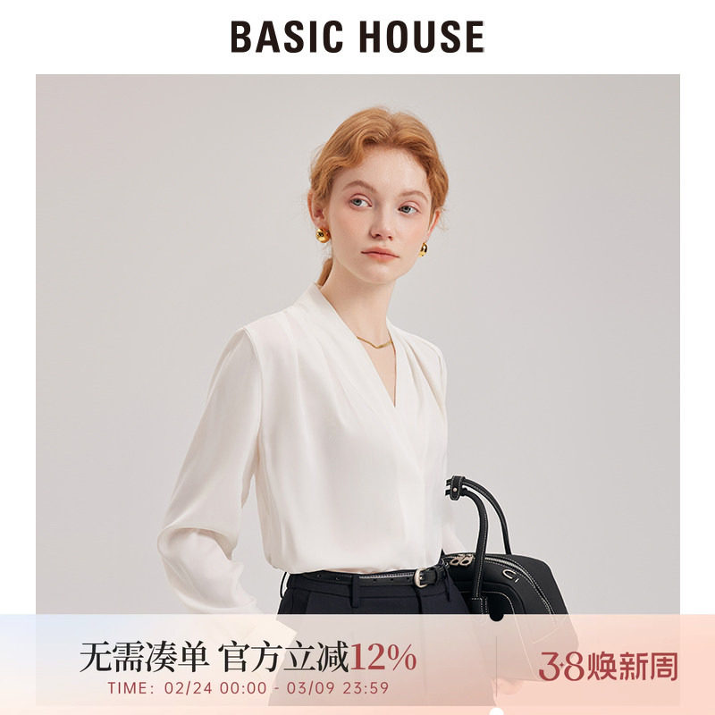 百家好泽芳长袖V领白衬衫女法式气质缎面衬衣职场轻熟风通勤上衣