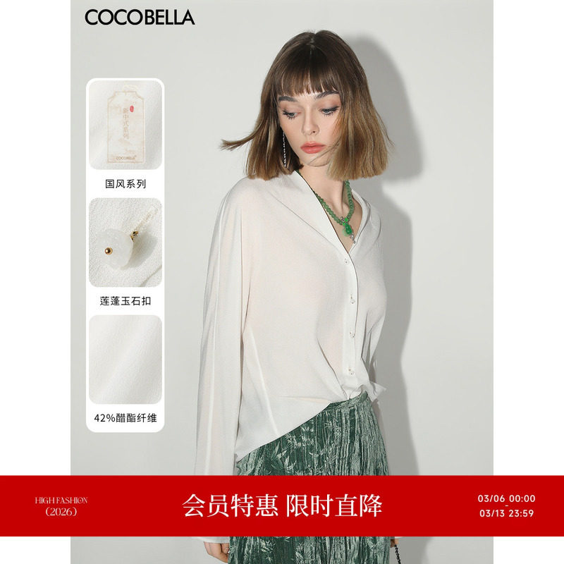【3件5折】COCOBELLA轻奢醋酸纤维新中式V领白衬衫质感衬衣SR0021