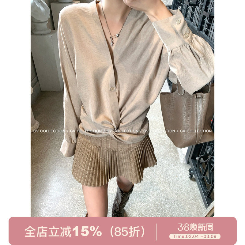 GV大白哥 高知感 V领褶皱收腰衬衫上衣春夏新款百搭气质休闲针织