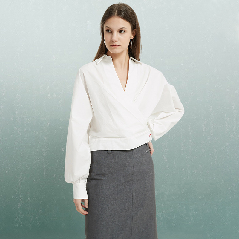 Petit Bari春夏设计感V领白衬衫女 短款高腰显瘦职场干练长袖上衣